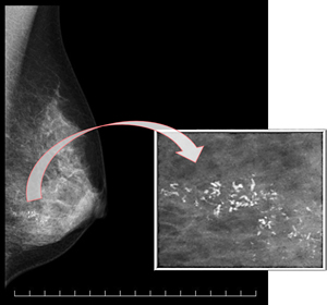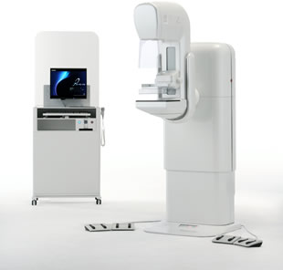 イークでは日本医学放射線学会の定める使用基準を満たしたデジタルマンモグラフィ撮影装置(DR)を設置しています。従来のフィルムとは異なり、デジタルの画素サイズが50~100μmという高精細なシステムFPD(Flat Panel Detector System)を用いて撮影することで、細かい石灰化や腫瘤の形状などを明瞭に描出することができます。