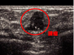 乳房超音波検査では写真のようにはっきりと腫瘤像を写しだす事ができます。また、乳管拡張や乳腺斑状像の変化・構築や厚みの変化などを確認することも可能です。