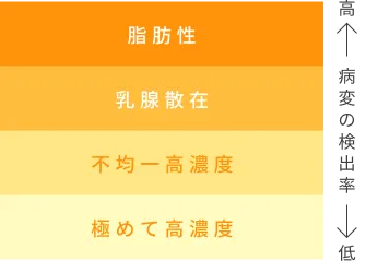 「脂肪性」「乳腺散在」「不均一高濃度」「極めて高濃度」の順に病変の検出率が低下すると言われています。